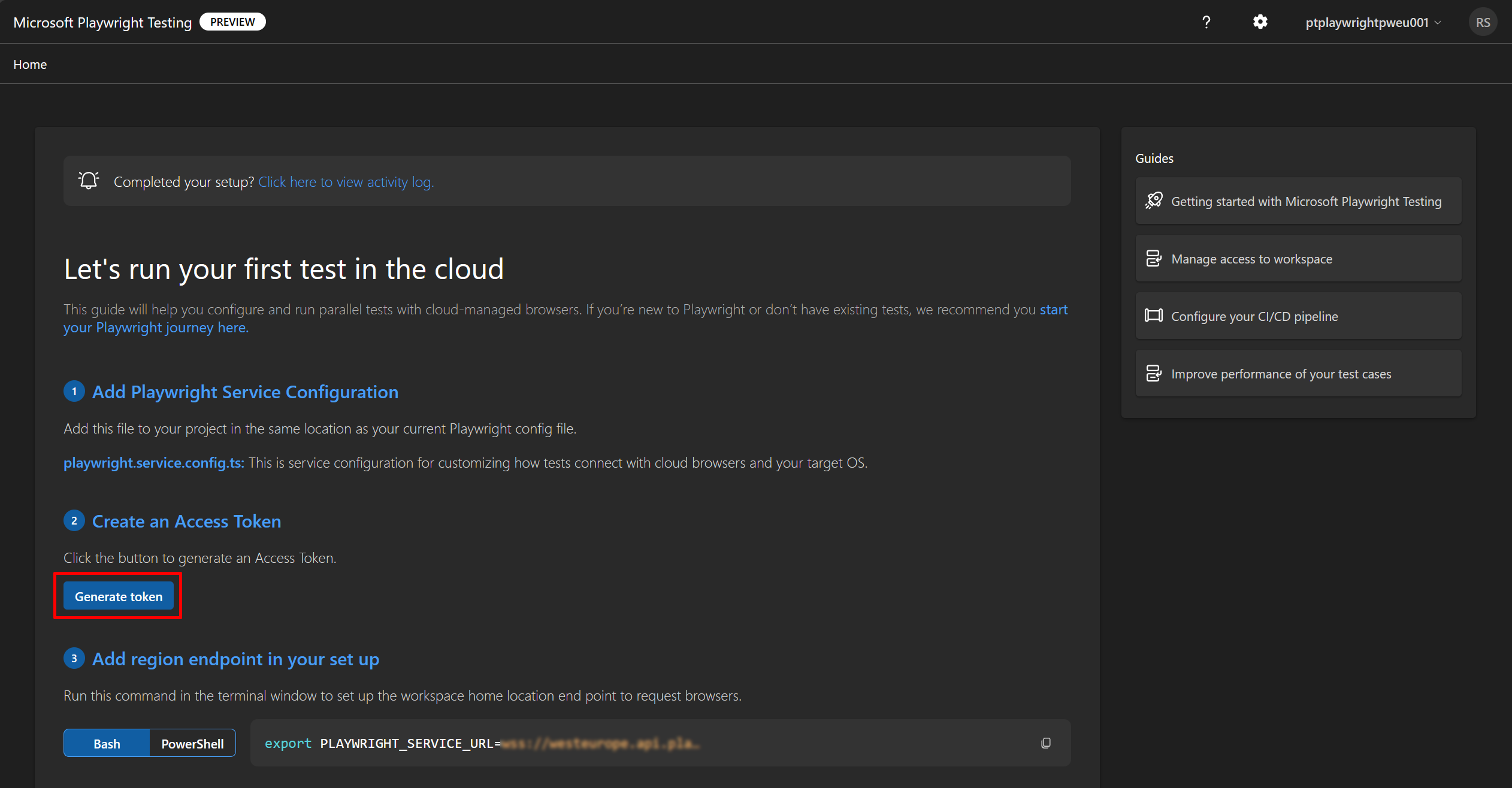 Step 8: You’ll be automatically routed to the setup guide of the Playwright Testing Workspace. Microsoft Playwright Testing uses access tokens to authorize users to run Playwright tests with the service. Firrst, we’ll generate a service access token in the Playwright portal, and then store the value in an environment variable, as previously mentioned in steps 2 and 3.