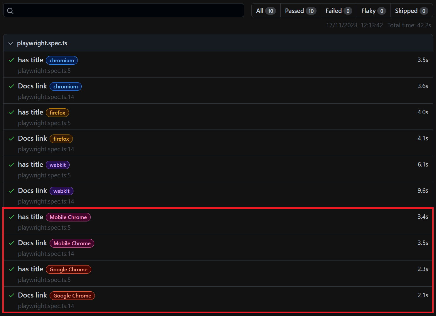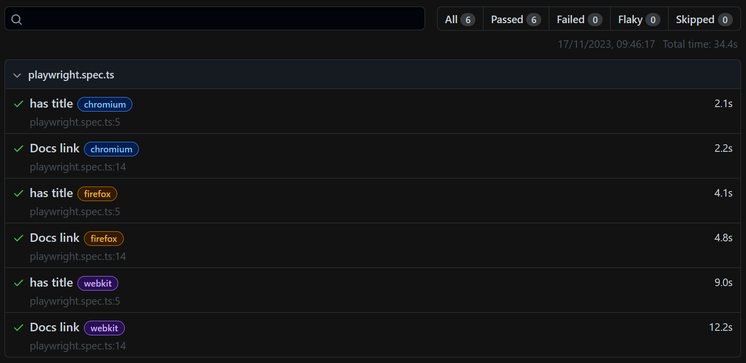 If we open the HTML report, using the npx playwright show-report command, the report shows that both tests were executed for the two new browsers we’ve just added.