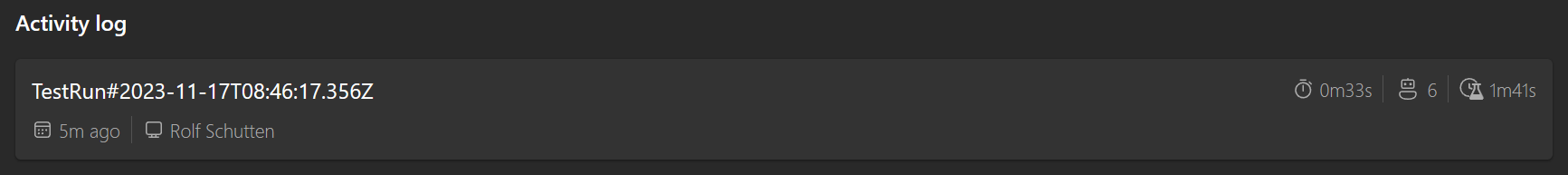 Step 16: Just as we did during step 10, refresh the Playwright portal page in your browser, to view the test run metadata and activity log for your workspace. The activity log has added our most recent test job, as we can see on the screenshot below.