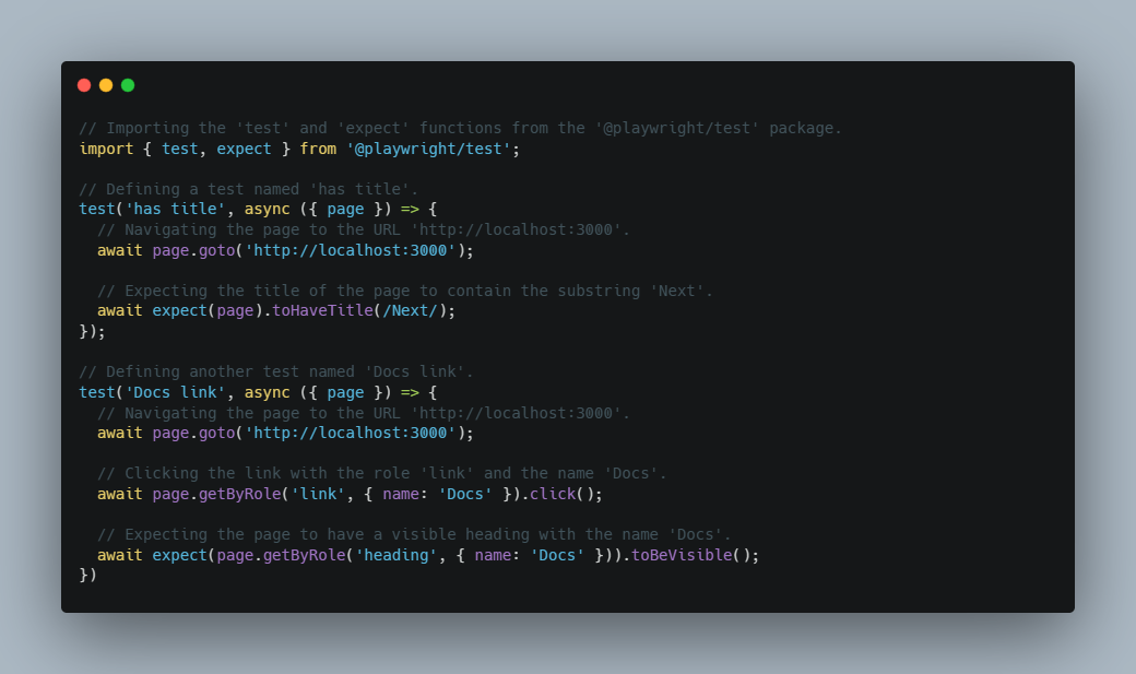 If you inspect the tests/example.spec.ts file, you will see that this sample script targets the https://playwright.dev website. In all likelihood, this is not your React project. It is therefore time to write our first Playwright script, for our own React project. Let’s write the same script from the ground up fo our own Next.js App.
