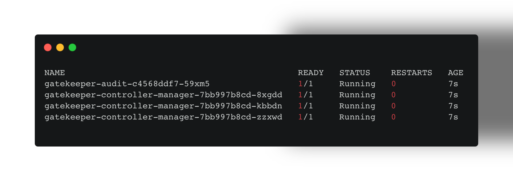 kubectl apply -f https://raw.githubusercontent.com/open-policy-agent/gatekeeper/master/deploy/gatekeeper.yamlStep 6 (optional): Once applied, you may want to verify the installation by running the command below: