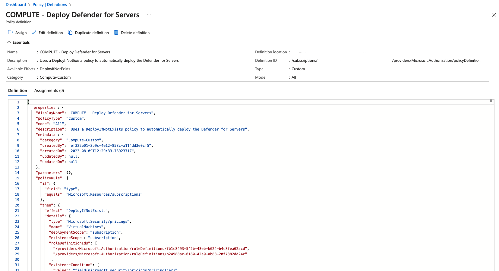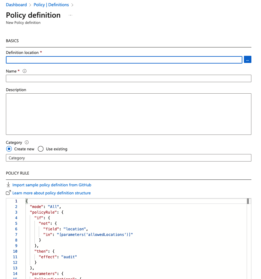 Click on “Definitions” to start creating a new policy. Select “Add a policy definition” to create a custom policy. Make sure you define the policy’s name, description, and metadata. You can also use a built-in policy, instead of creating a custom policy.