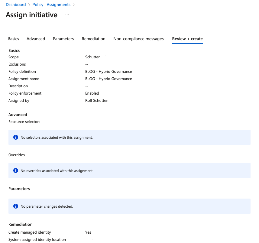 Navigate back to the “Azure Policy” service and click “Assignments” and click “Assign initiative”. Select the desired scope, your freshly created initiative definition, and apply the policy or initiative to it. Complete the steps for reviewing and confirming the assignment.