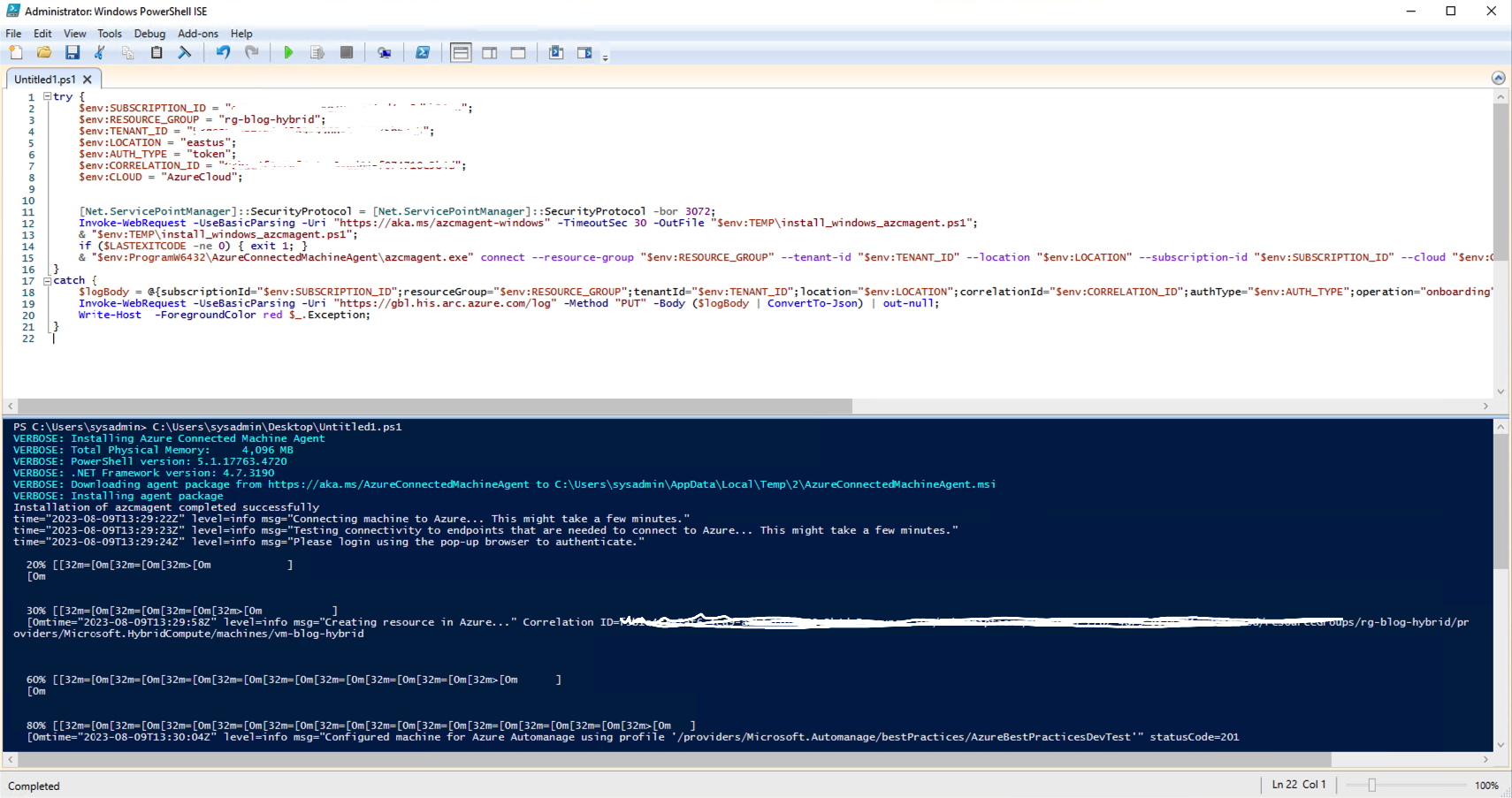 Log in to your server/virtual machine. Download and install the Azure Arc-enabled servers agent on the on-premises server by executing the script in PowerShell. During installation you’ll be asked to login with your Azure credentials for authentication.