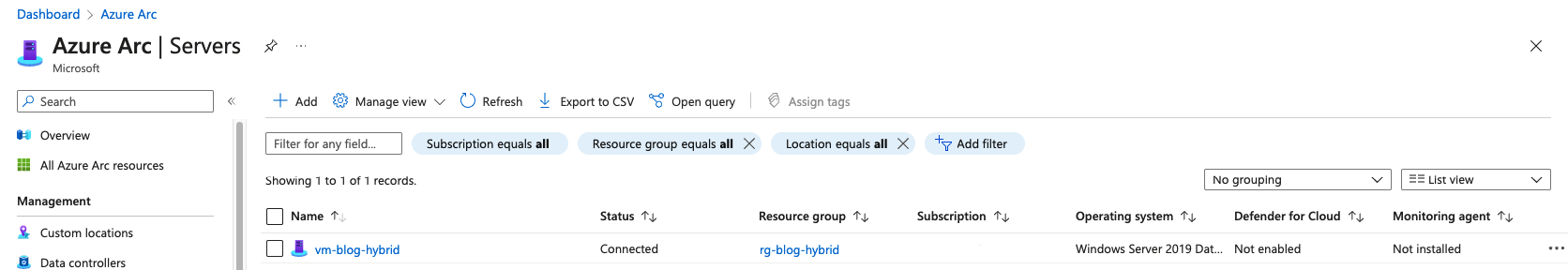 Return to the Azure portal and check the server’s registration status. Once registered, the server will appear in the Azure Arc servers list.