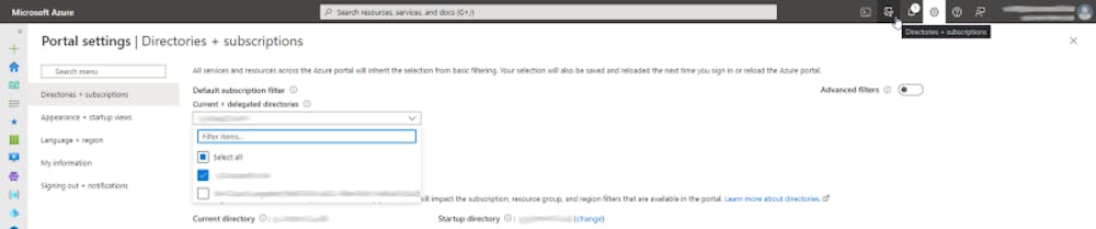 Once your deployment has succeeded, we’ll validate the creation of the resource group in the Azure Portal. Being logged in with the service provider account, click on the cogwheel in the top right corner. In the Directories + subscriptions blade, make sure you’ve selected the customer directory and subscriptions.