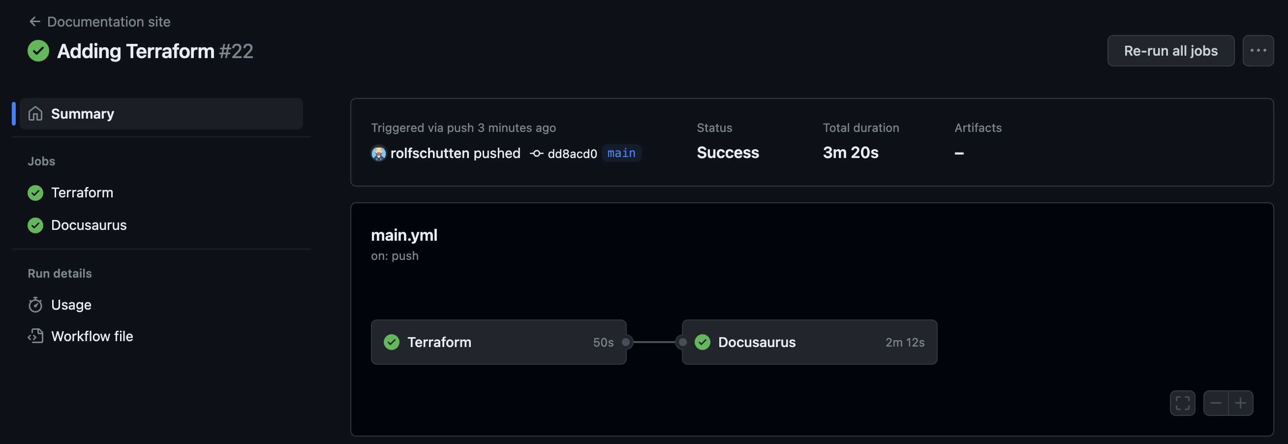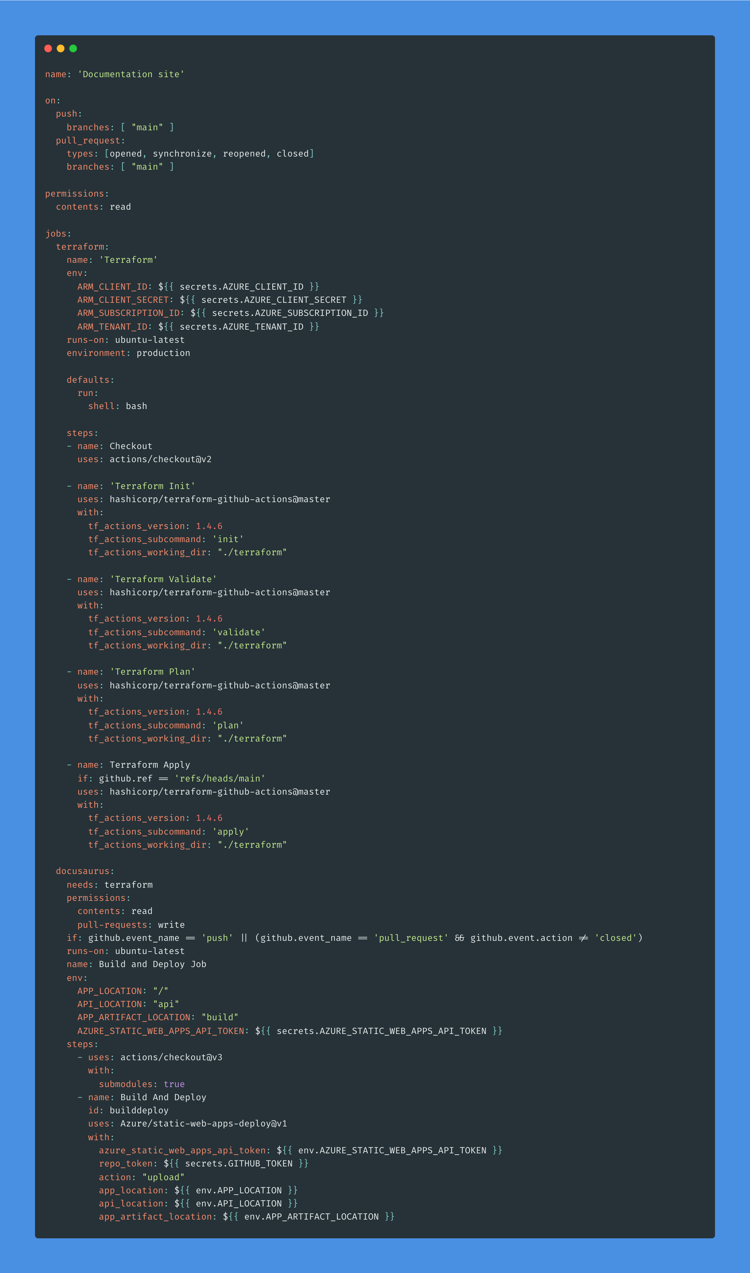 This workflow creates and configures the infrastructure in Azure using Terraform, and deploys our Docusaurus site to Azure using the Azure Static Web Apps Deploy action.