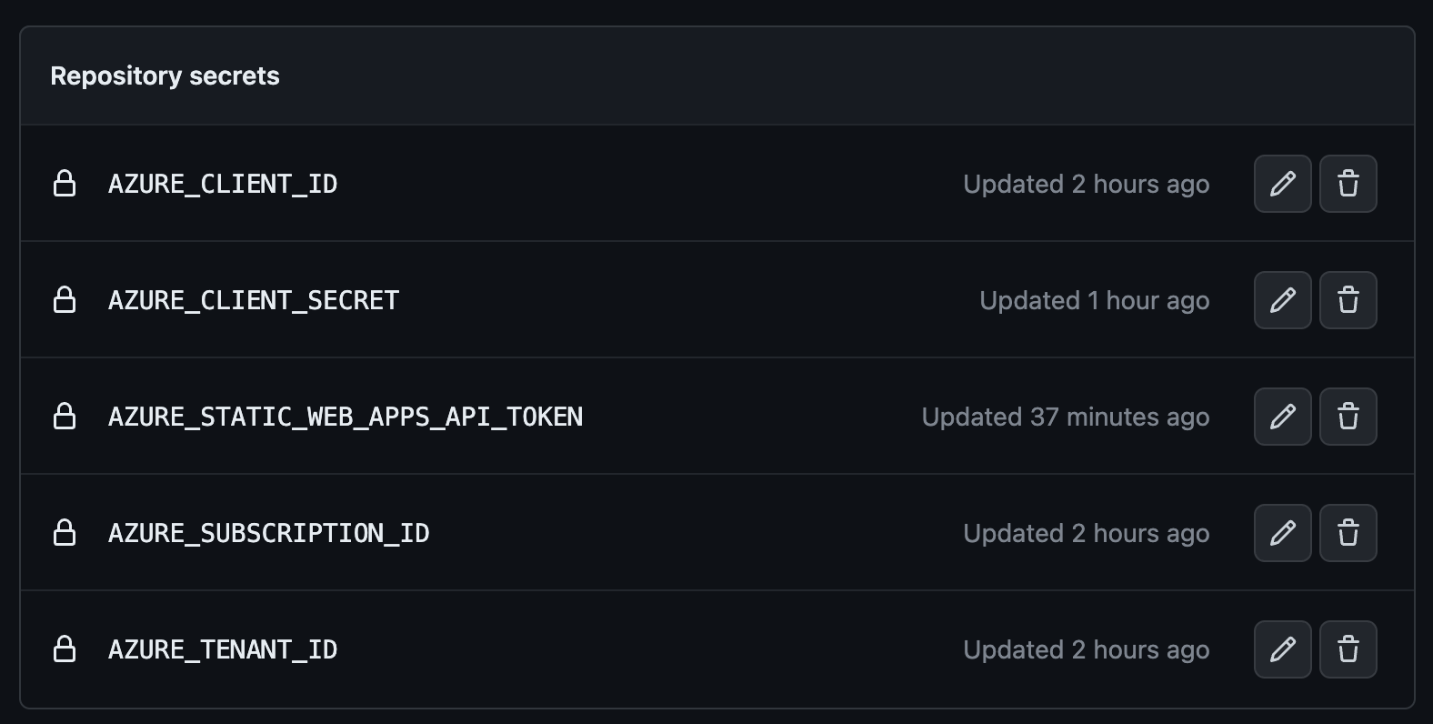 Note: If the Azure Static Web App is recreated, you must also update the secret deployment key in your GitHub repository, which we’ve created with the name