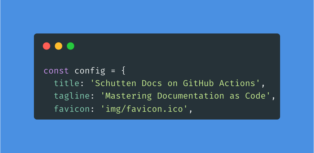 Step 11: Navigate to the docusaurus.config.js file in the root directory of the Docusaurus site, and open it in Visual Studio Code, or other code editor you’re using. Modify the title field and save it. For example, if you want to change the title to “Schutten Docs on GitHub Actions", your code would look like this: