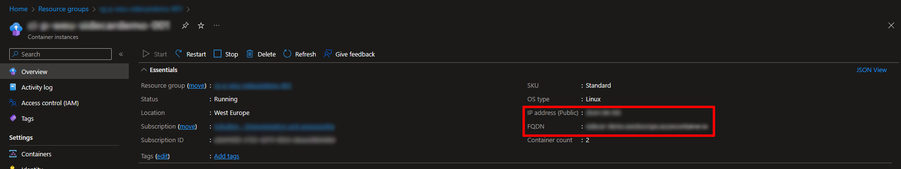terraform applyWhen done correctly, you’ll find the freshly created resource group, and the container instances with 2 containers, when you browse to the Azure portal.