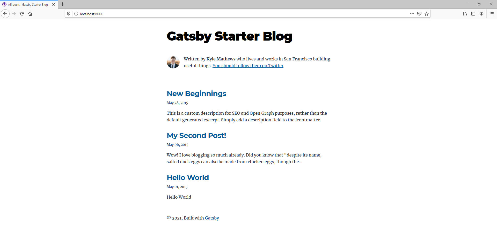 Back to your internet browser, showing you the local website that is still running (if not, run the gatsby develop command again). Your website will look something like this: