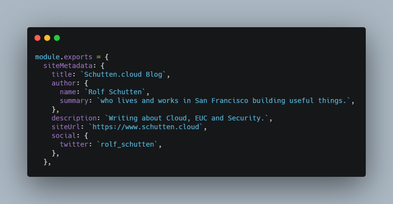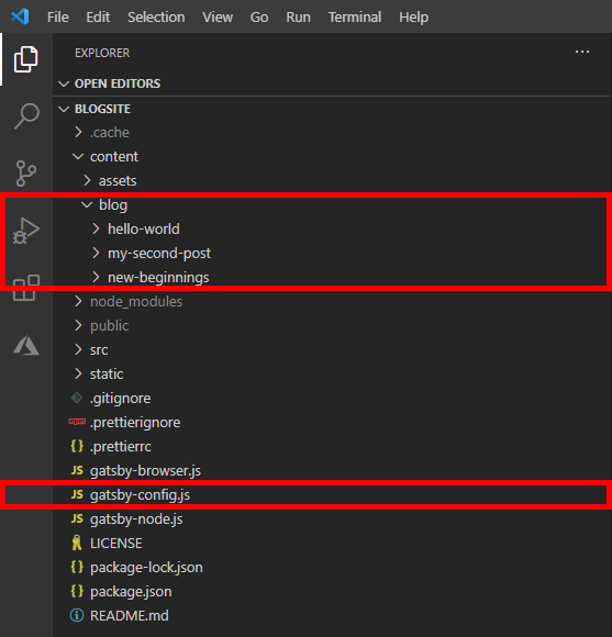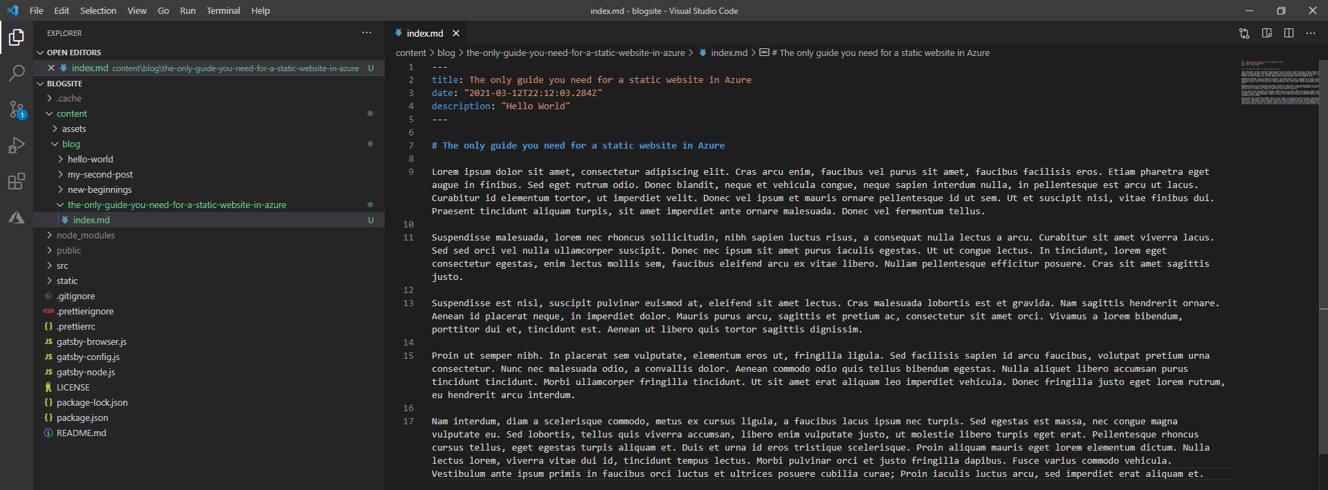 A blog site is of course intended to share content with the rest of the world. Open the folder where your Gatsby project is located in Visual Studio Code. In the steps below you are going to edit the author information in the * “gatsby-config.js” * file, and you are going to add your first blog article.