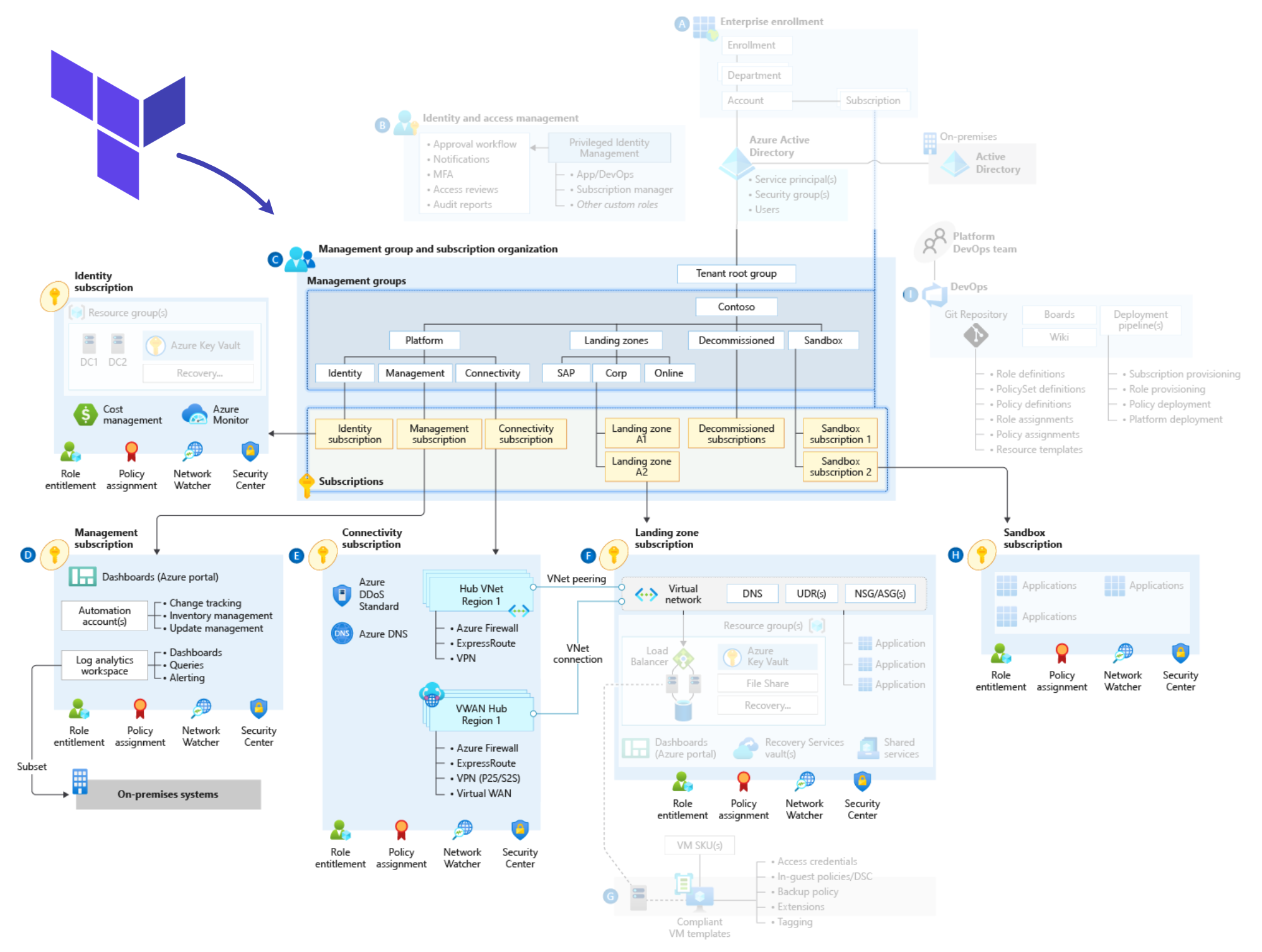 - Azure landing zones for management groups, policy definitions, policy assignments and RBAC