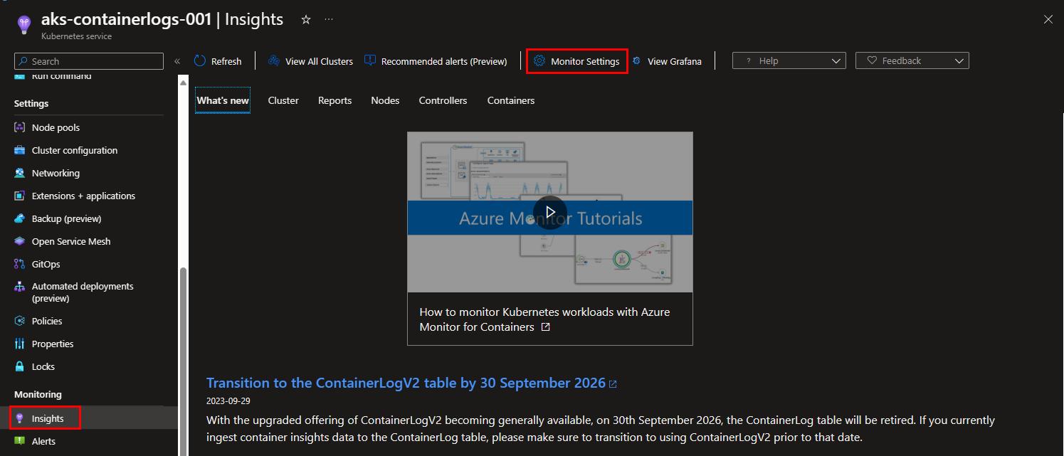 Step 1: Go to your Kubernetes cluster, and select “Insights” from the blade on the left. Select the “Monitor Settings” button at the top of your screen.