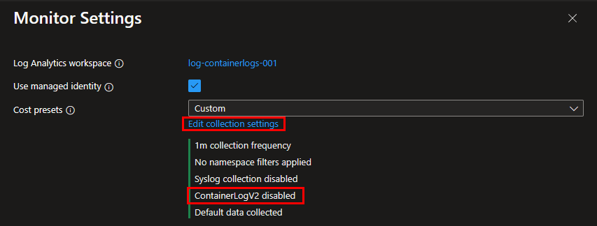 Step 2: In the appearing window on the right, it tells you that ContainerLogV2 is disabled. If not, ContainerLogV2 is probably already enabled. If it’s not enabled, click on “Edit collection settings” to open the advanced settings.