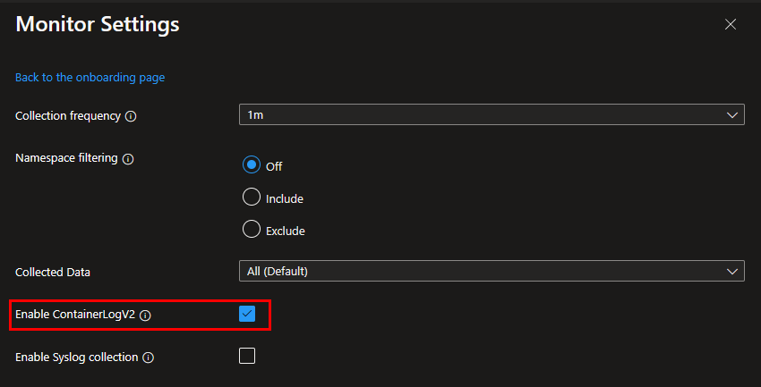 Step 3: Enable ContainerLogV2 by selecting the checkbox next to this option. Don’t forget to hit the “Save” button below, before leaving this window.